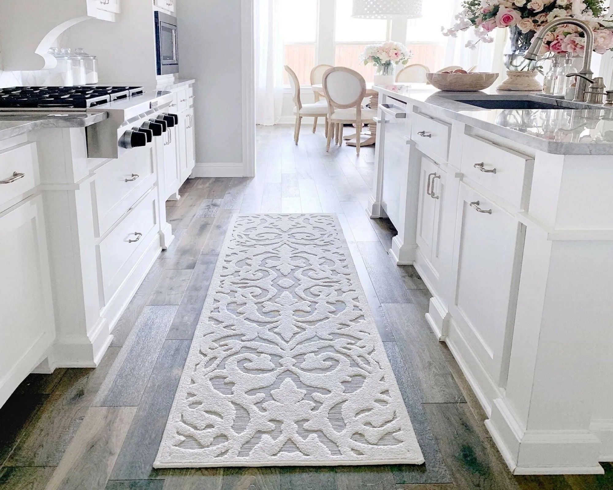 1. السجاد المنقوش: هو الخيار المثالي لديكور المطبخ ذي الألوان السادة كما في الصورة بالأعلى، تضفي نقوشة مرحا وحيوية وجاذبية على أي مكان، كما أنه يحدث توازنا في المظهر العام بعيدا عن الملل أو النمطية.