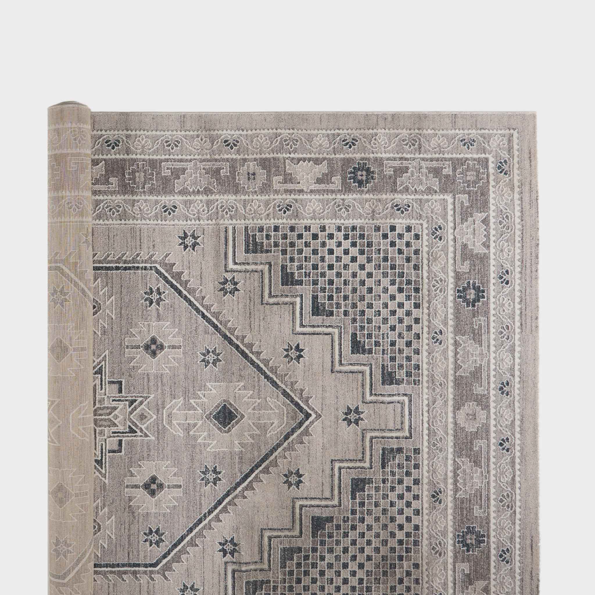 سجادة بصرى تجمع بين الأناقة الكلاسيكية واللمسات العصرية، بتصميم رمادي أنيق ونقوش دقيقة، تضفي لمسة من الفخامة والهدوء على أي مساحة.