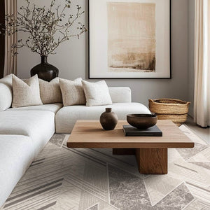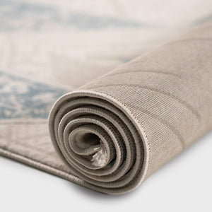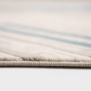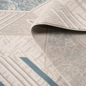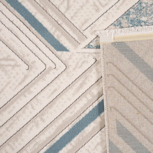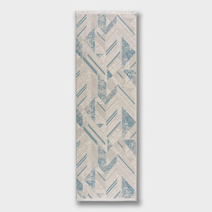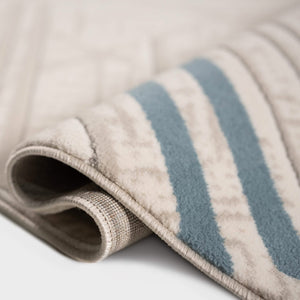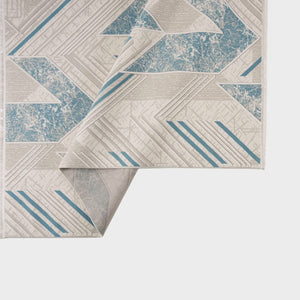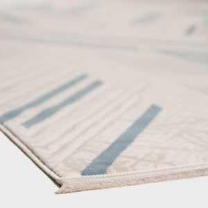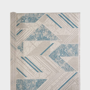 ‘Roza’ rug blends simplicity and elegance with a soft geometric design in sky blue and gray, lightweight, durable, and perfect for modern spaces.