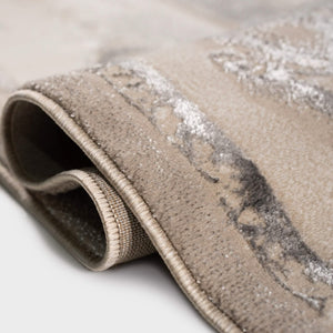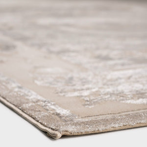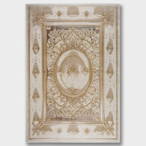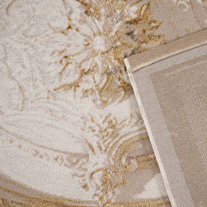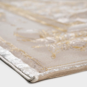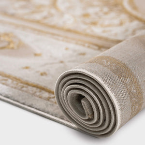 Majdoleen Classic Rug combines elegant grey and gold tones with a timeless classic pattern, offering a luxurious, warm touch to living rooms or majlis in various sizes.