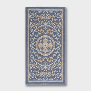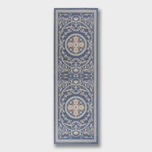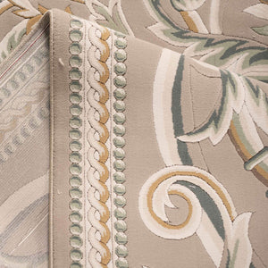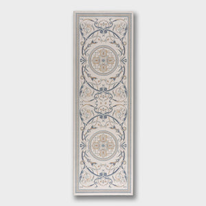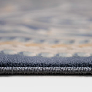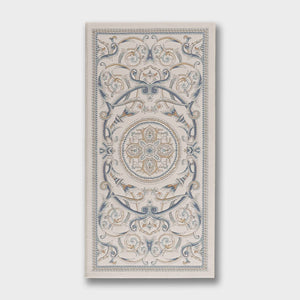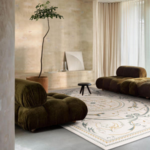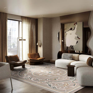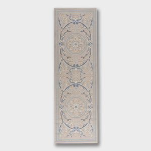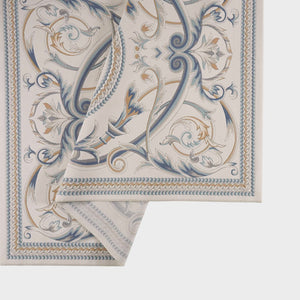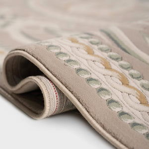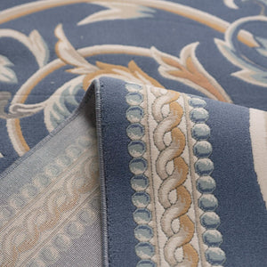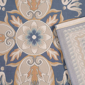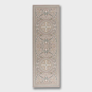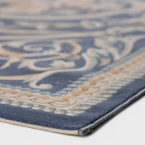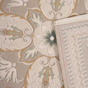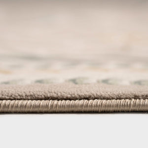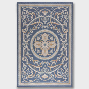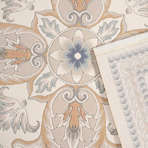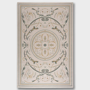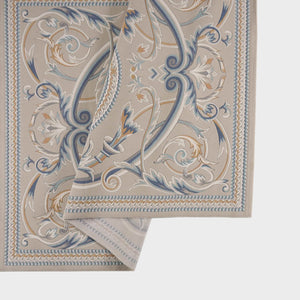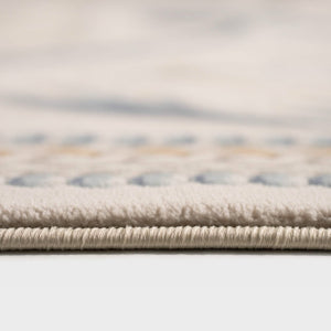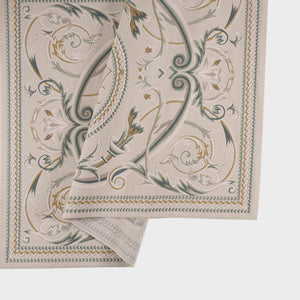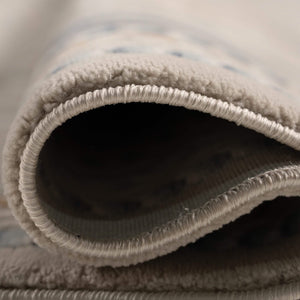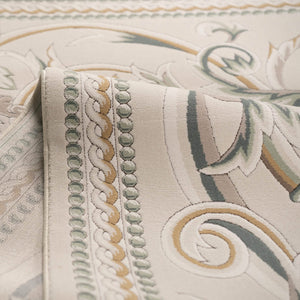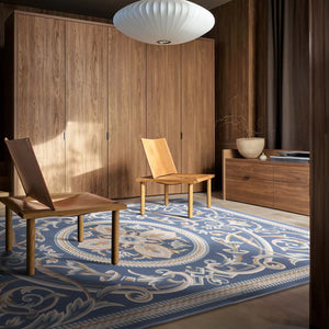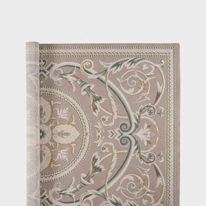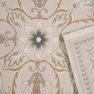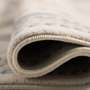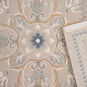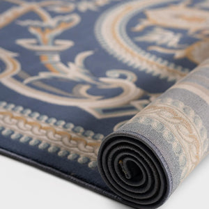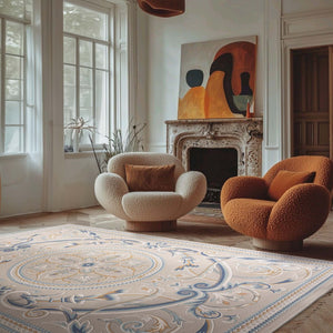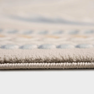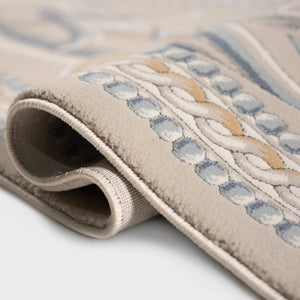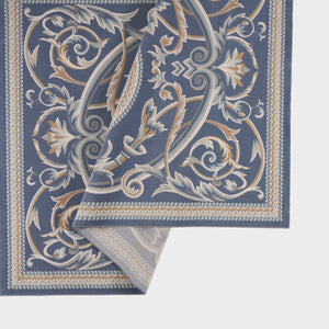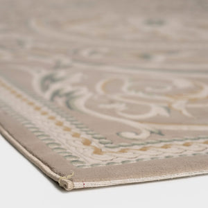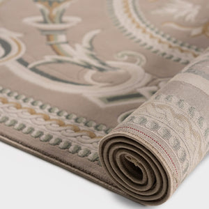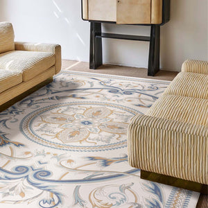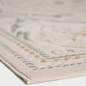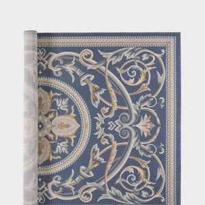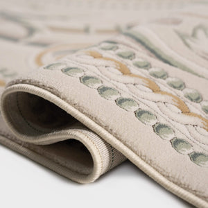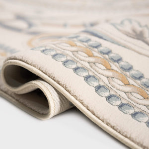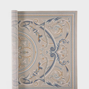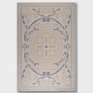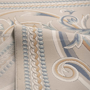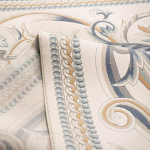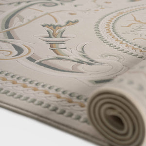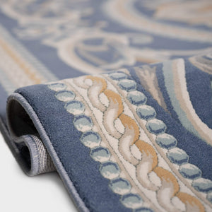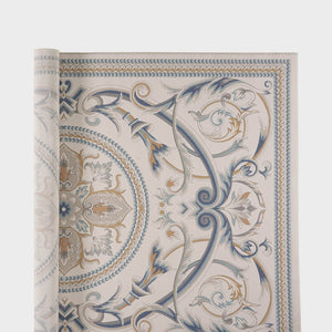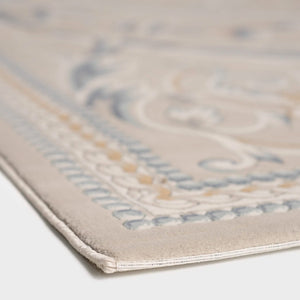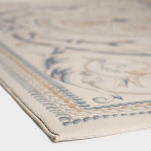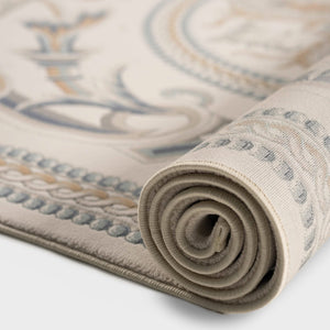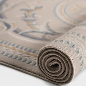 Paris rug in gray, beige, blue, gold, or cyan with a classic pattern and elegant French motifs, adding warmth and sophistication to your home’s ambiance.