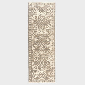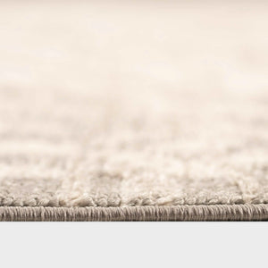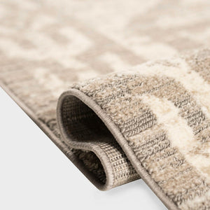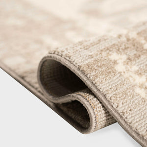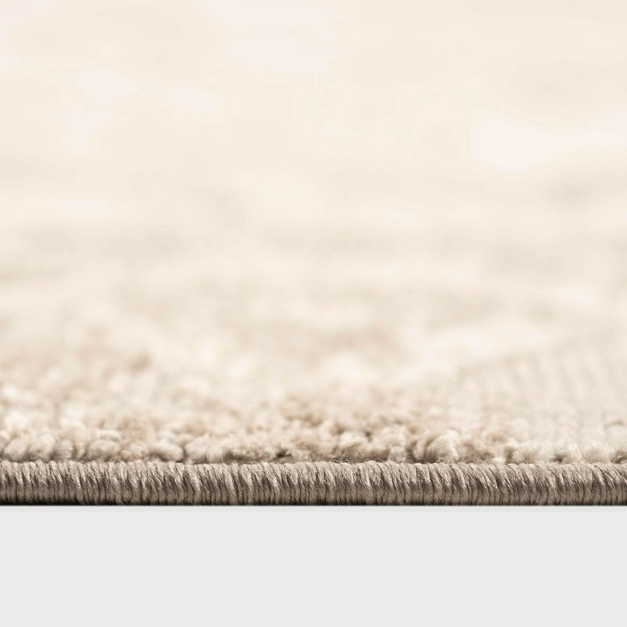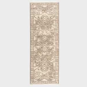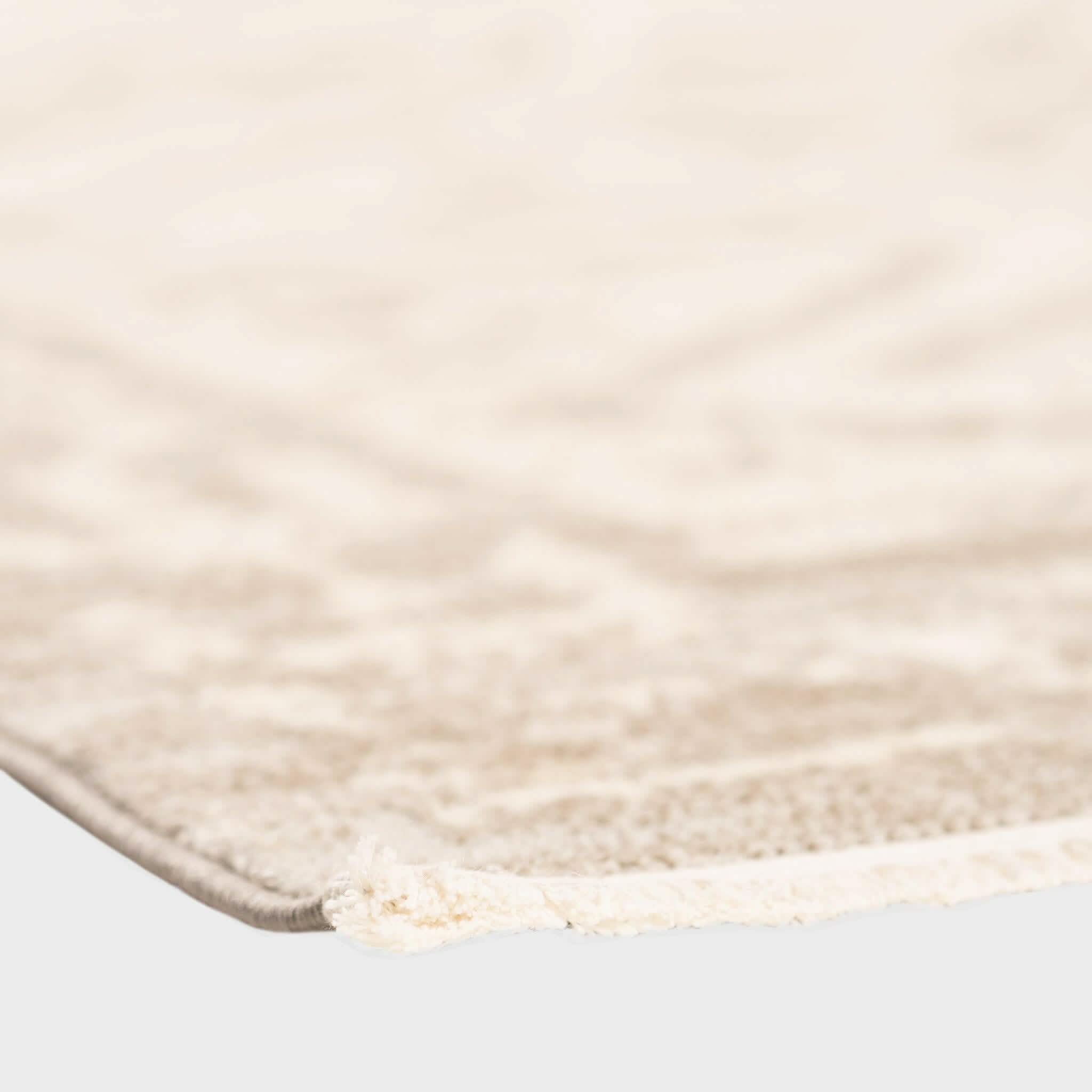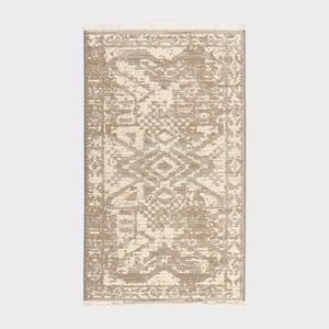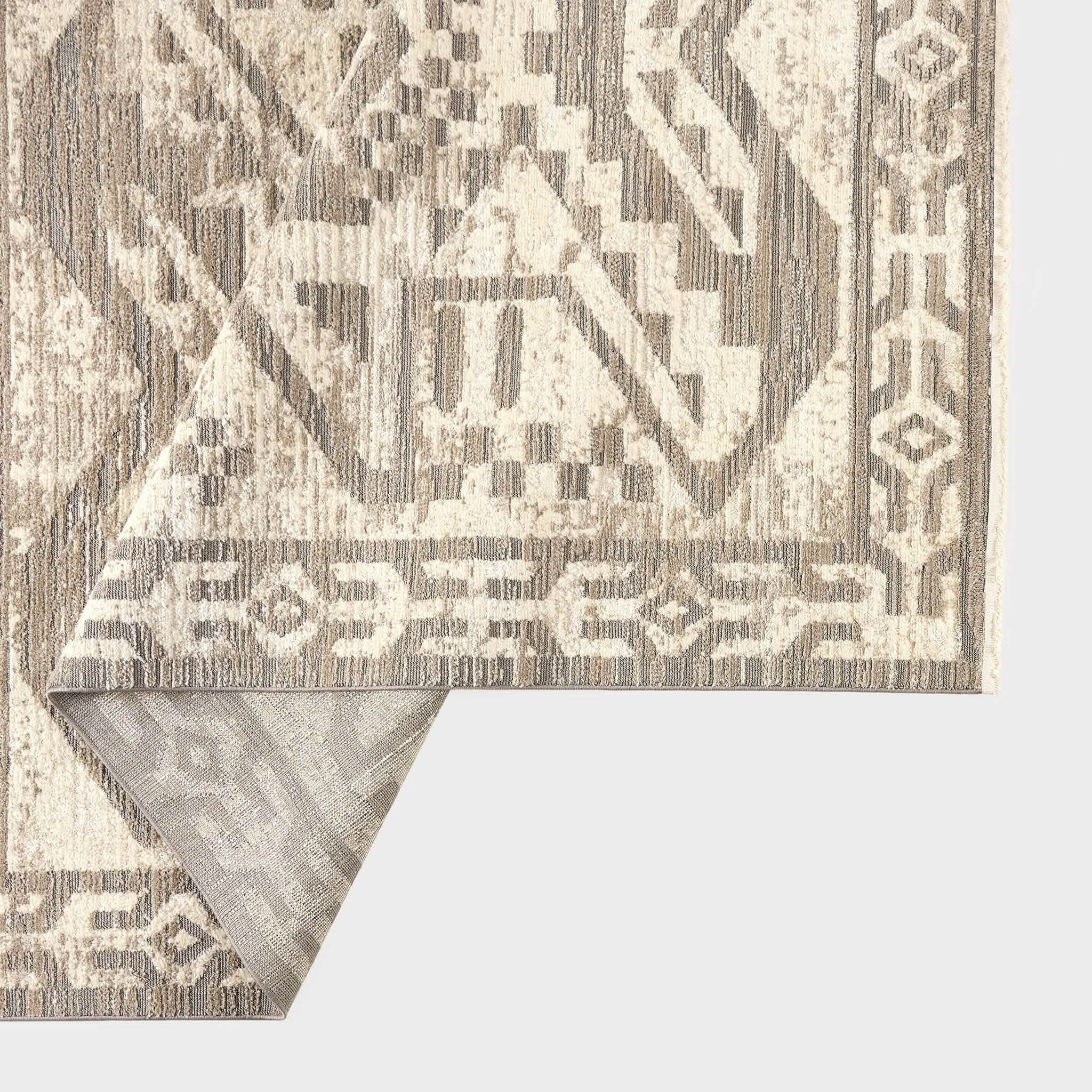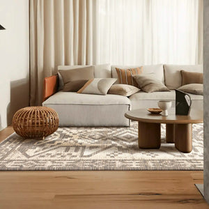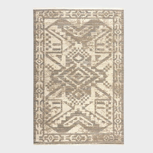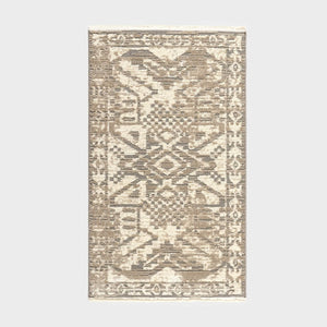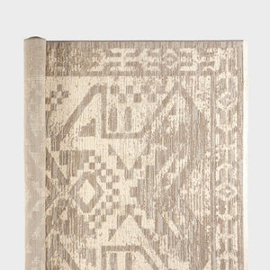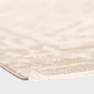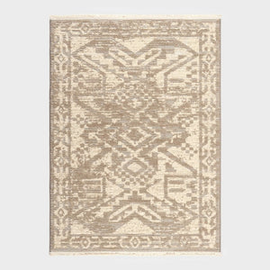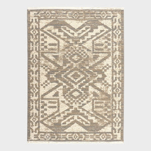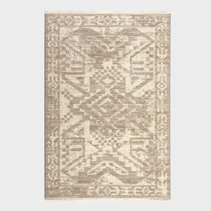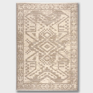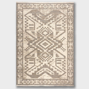 سجادة "بيسان" البوهيمية بيج ناعم مع نقوش رمادية وبيج، تضفي أناقة عفوية ودفء مريح لأي مساحة.