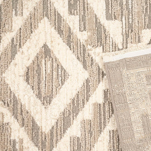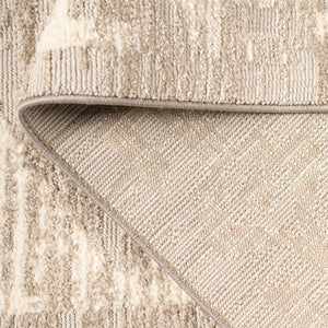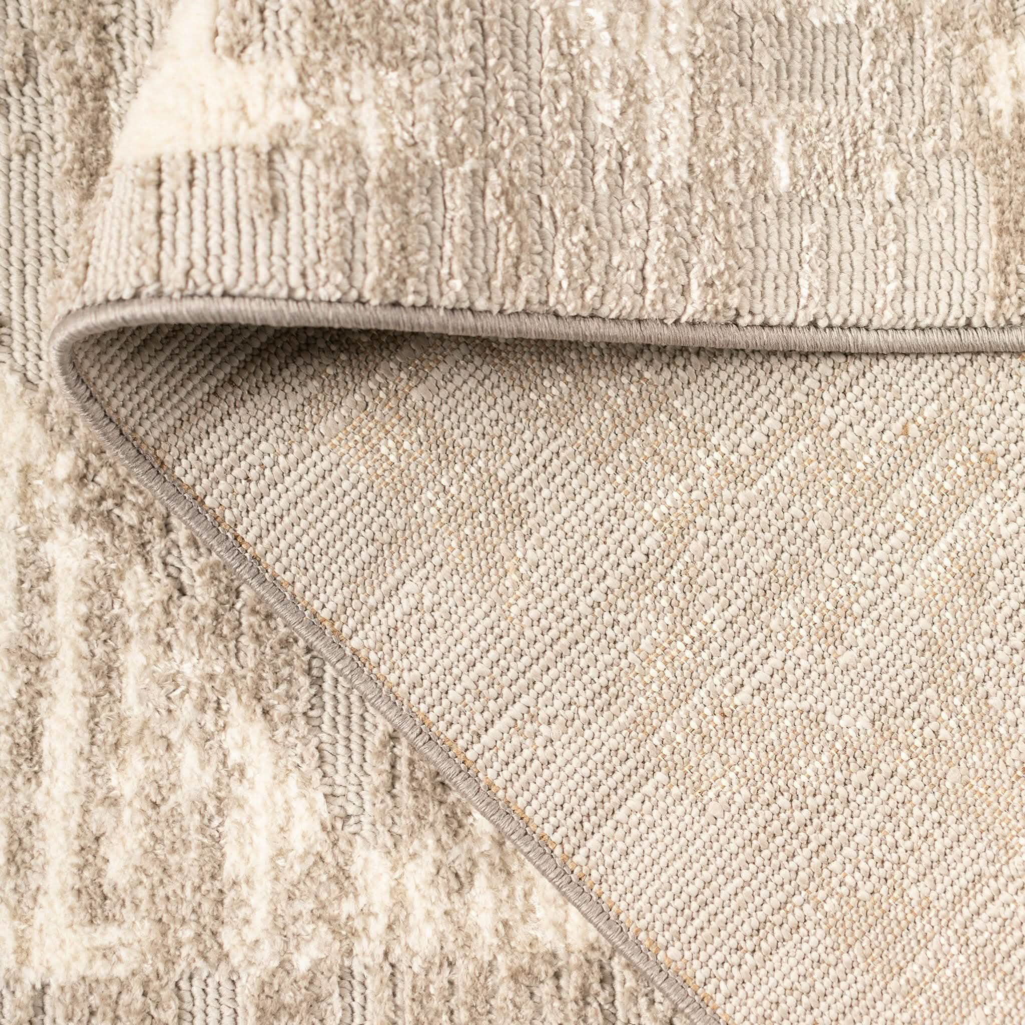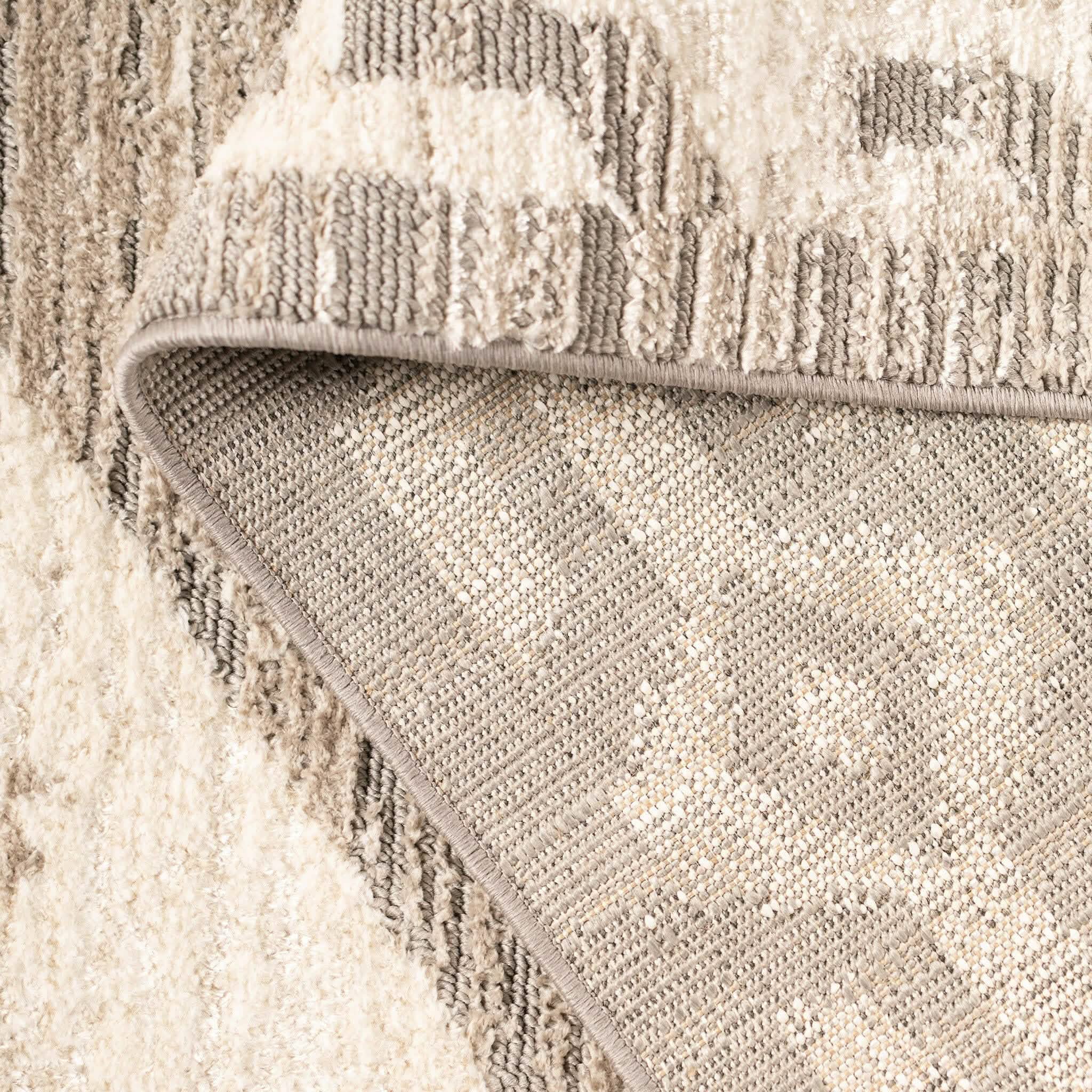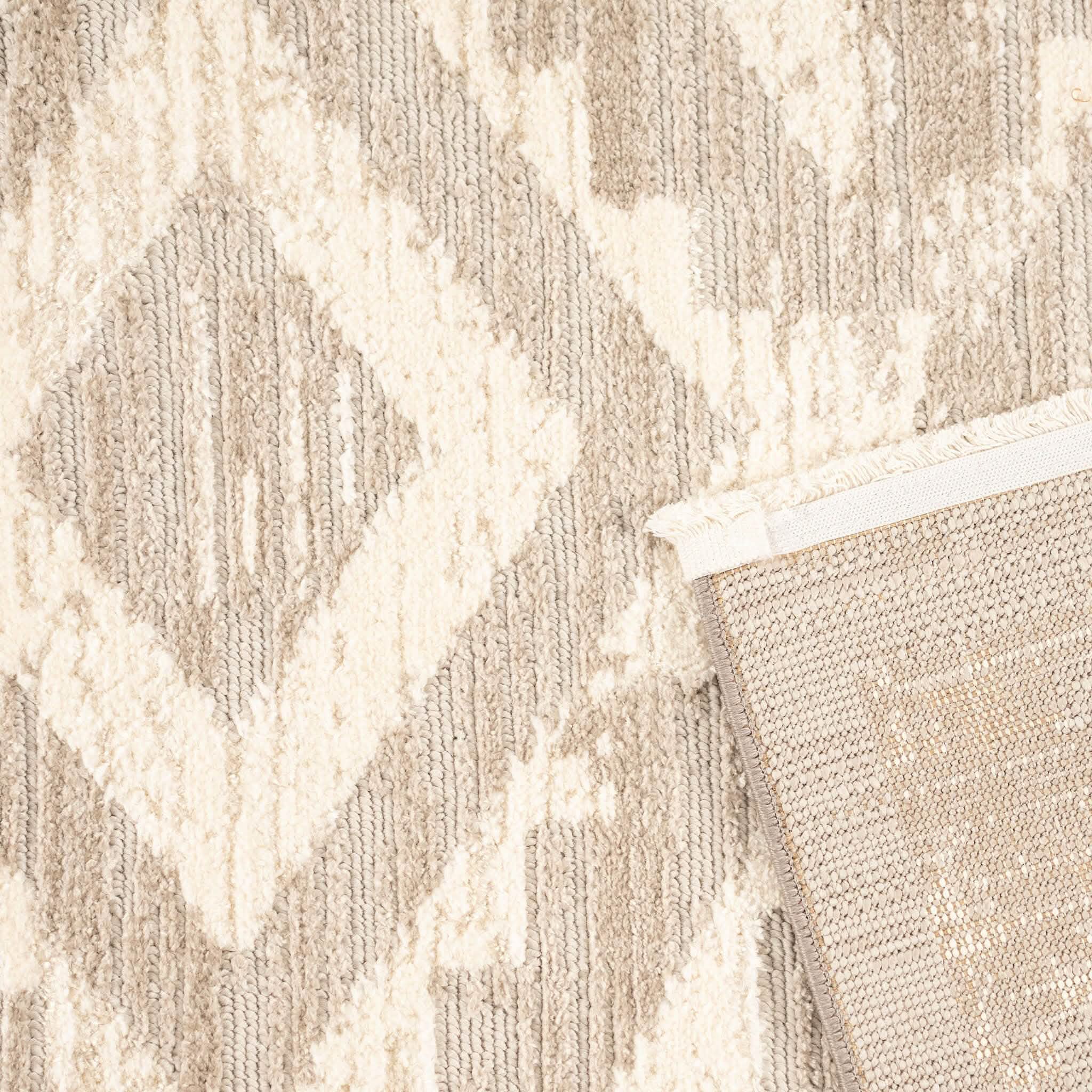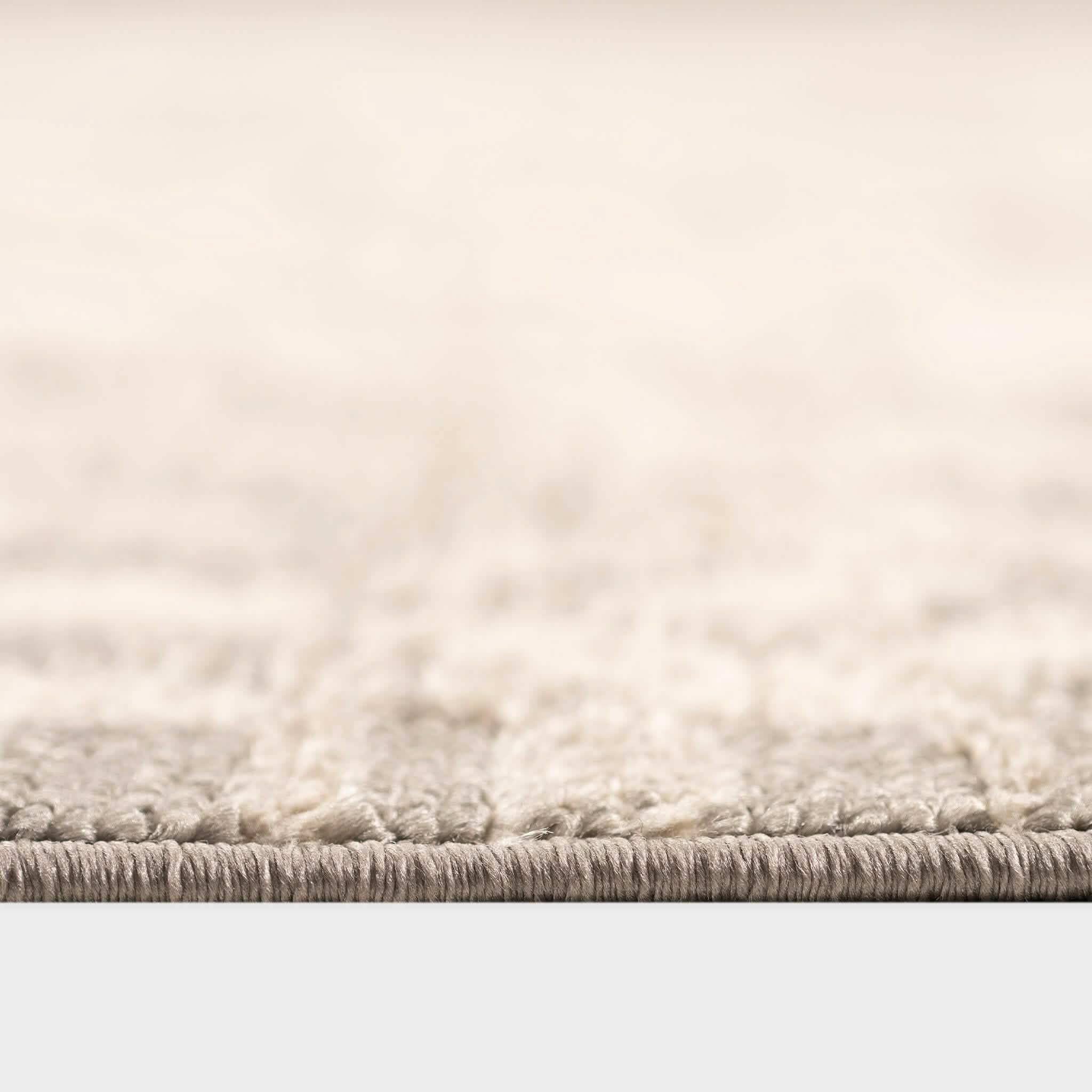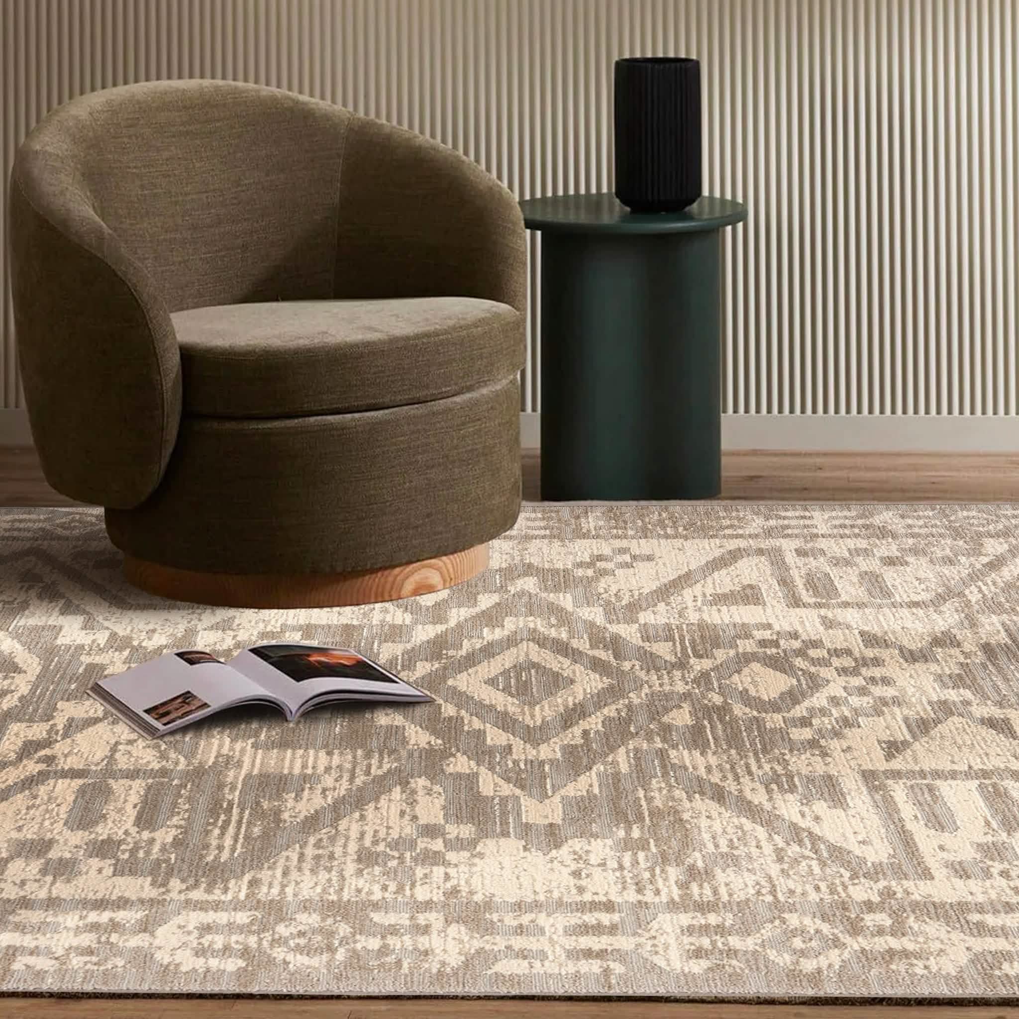 سجادة "بيسان" البوهيمية بيج ناعم مع نقوش رمادية وبيج، تضفي أناقة عفوية ودفء مريح لأي مساحة.