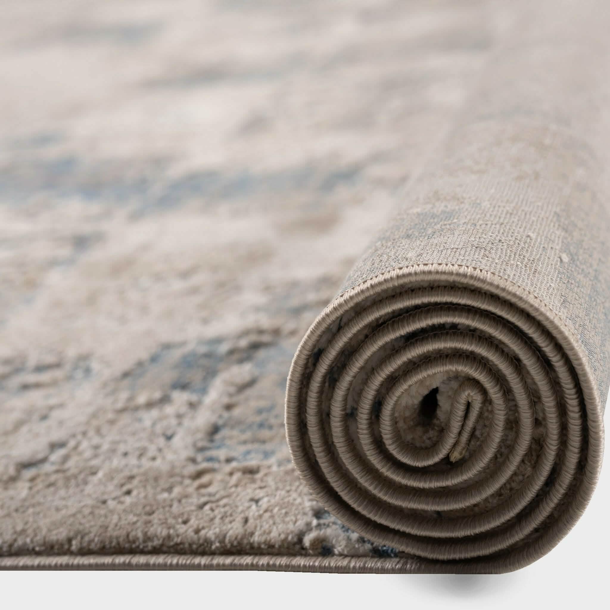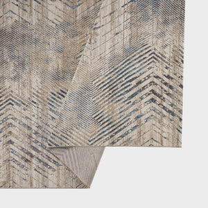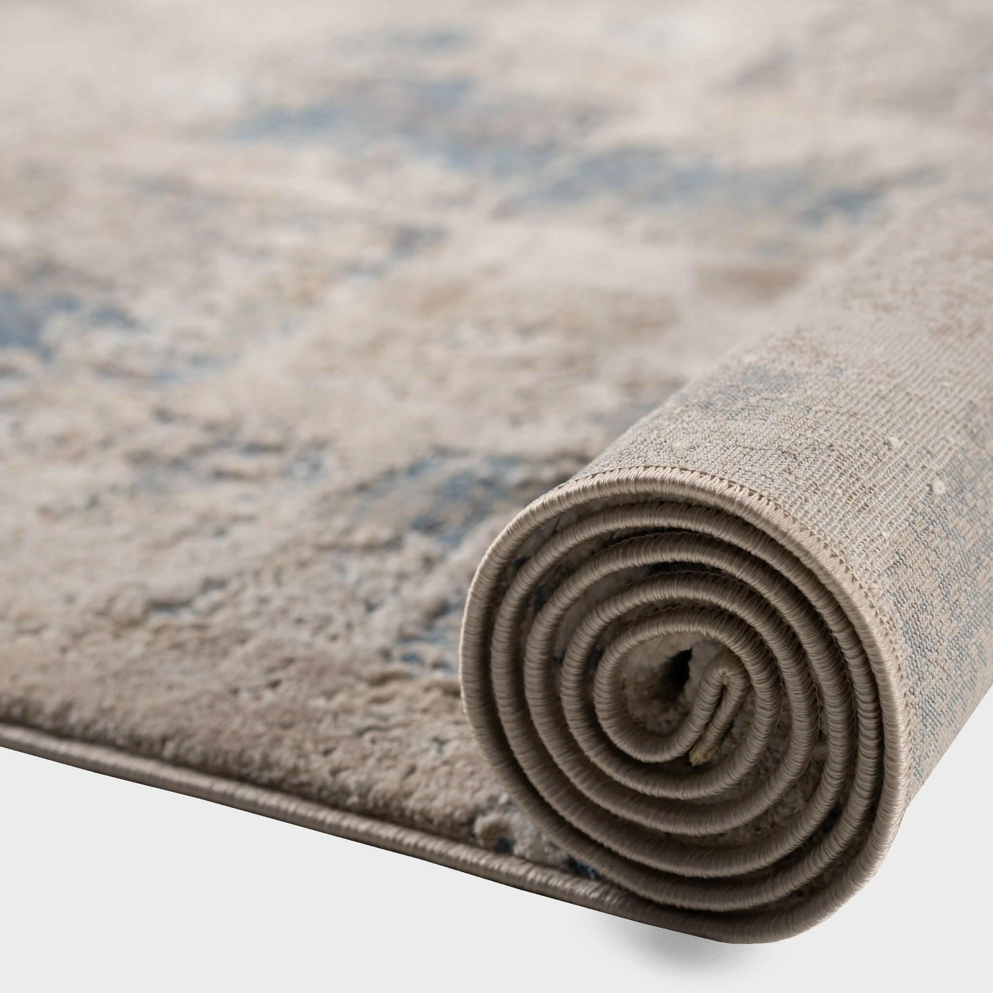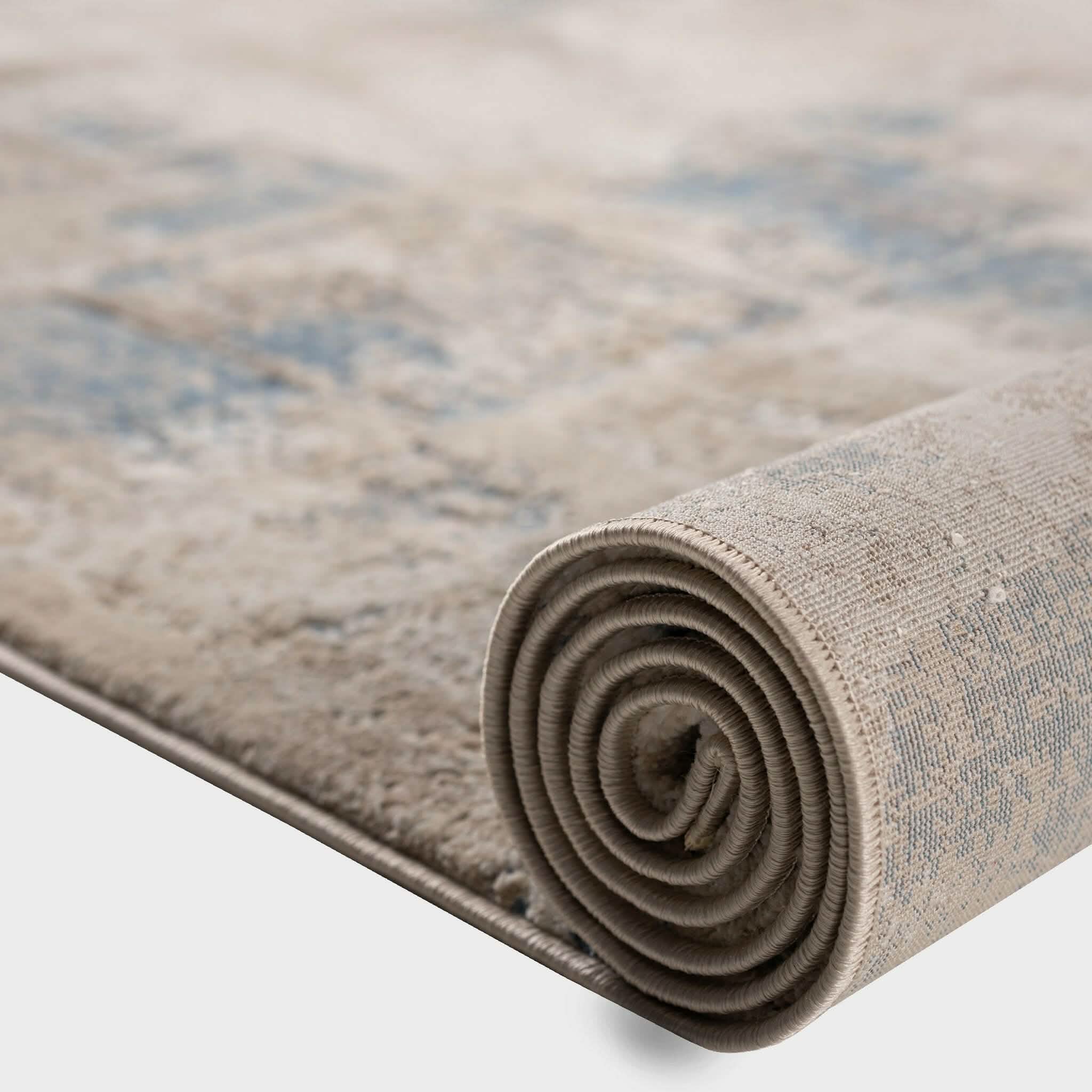 سجادة "ميلا" مودرن بخلفية بيج ونقشتين بالذهبي والأزرق، تضيف حيوية وتوازنًا هادئًا، مثالية للمساحات المفتوحة والعصرية.