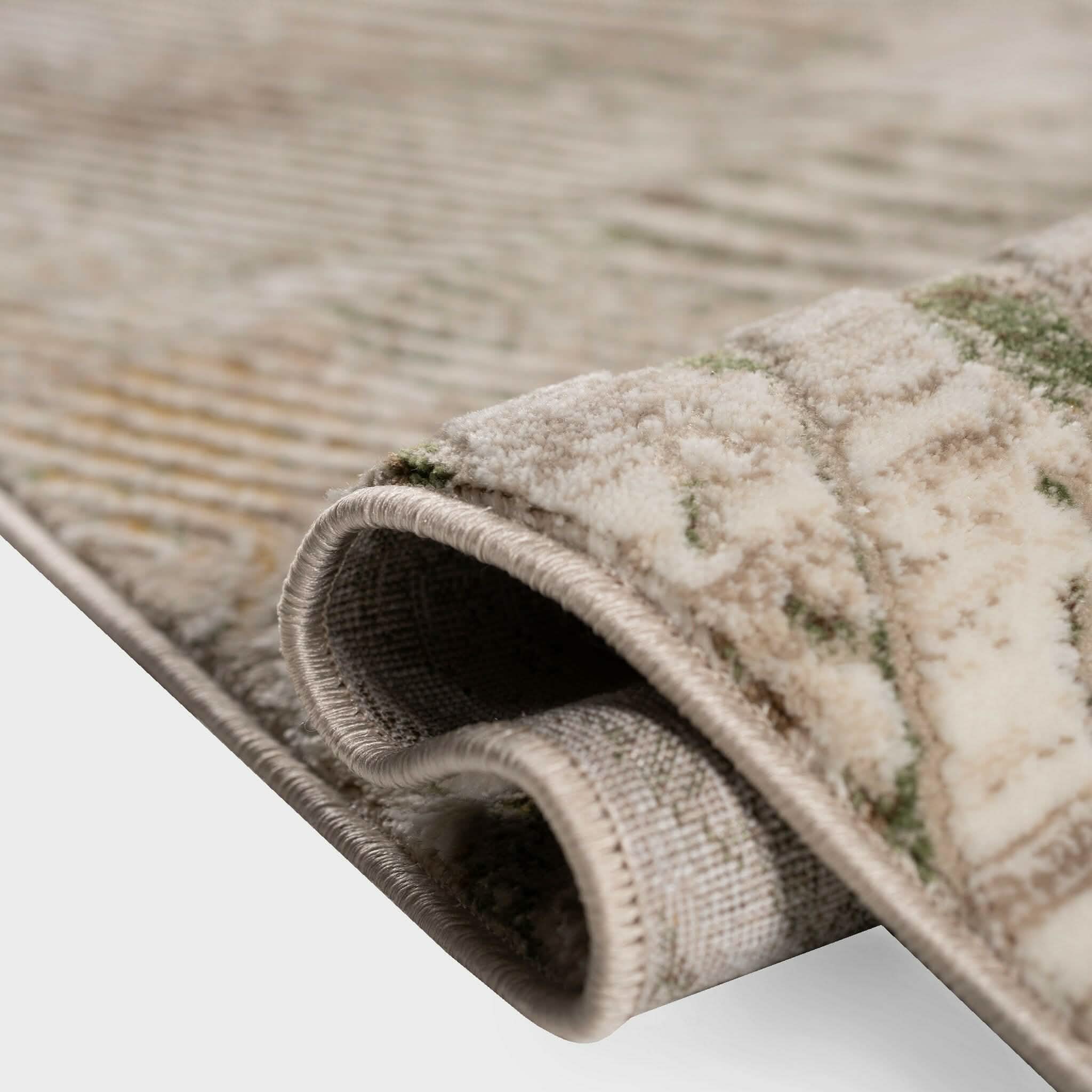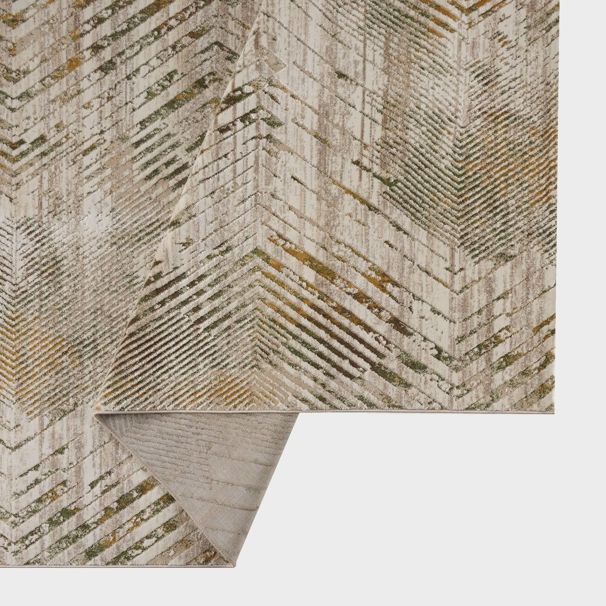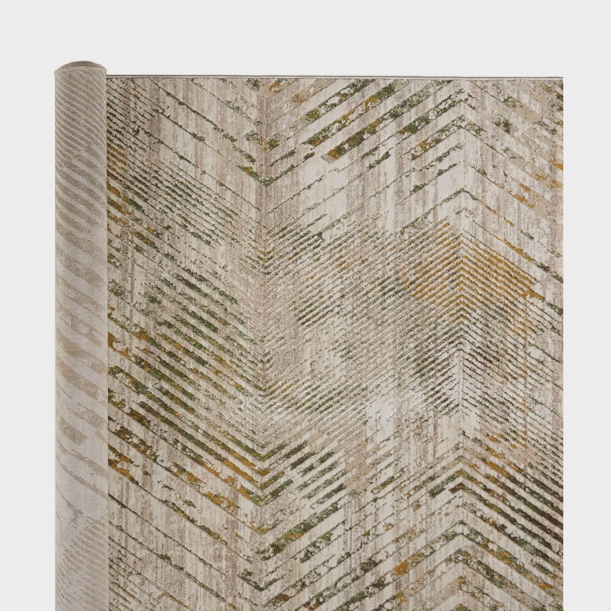 سجادة "ميلا" مودرن بخلفية بيج ونقشتين بالذهبي والأزرق، تضيف حيوية وتوازنًا هادئًا، مثالية للمساحات المفتوحة والعصرية.