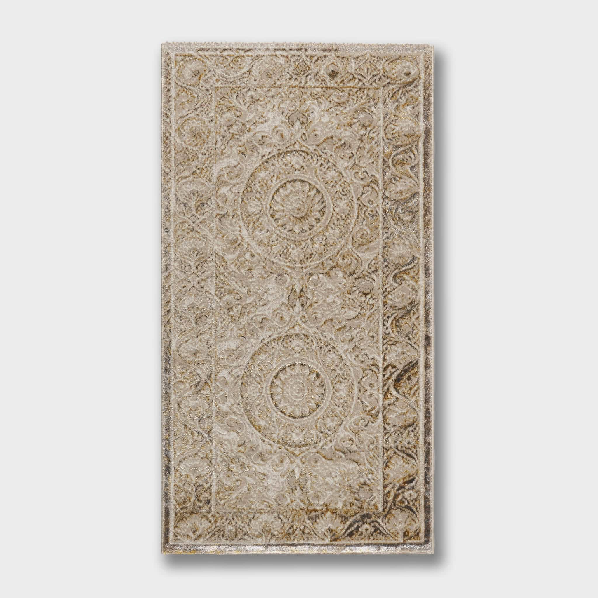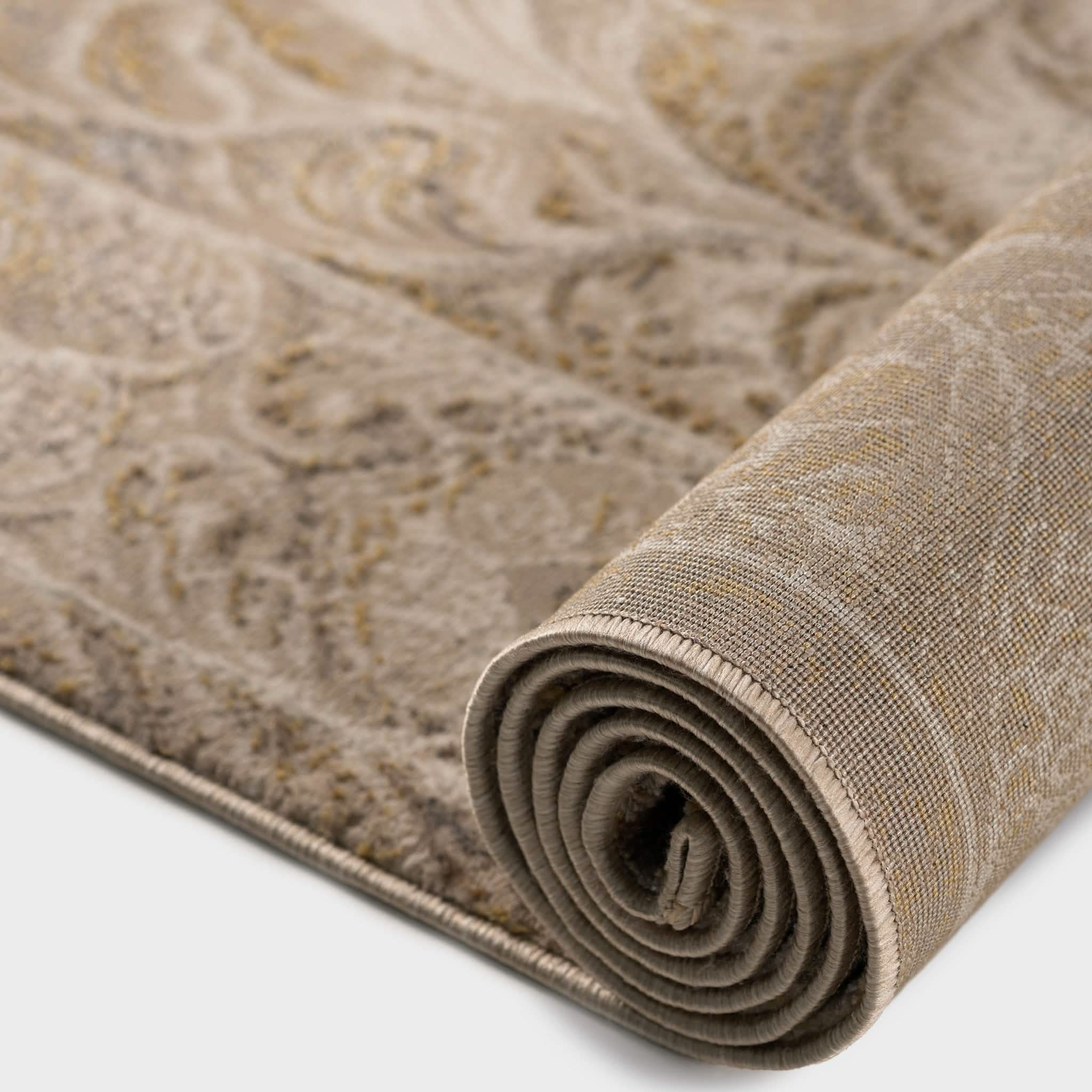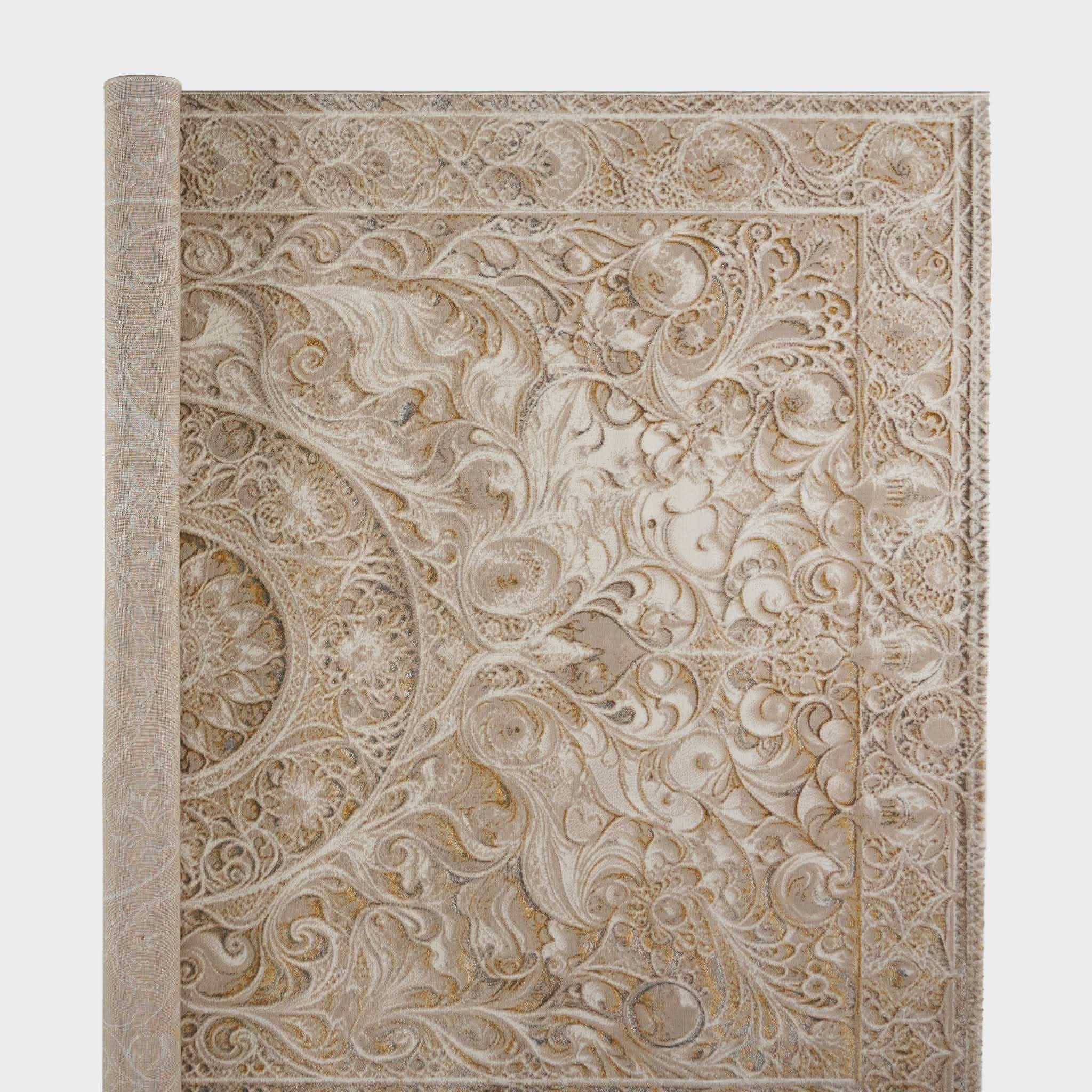 سجادة نرجس بتصميم كلاسيكي أنيق بألوان بني ورمادي هادئة، تضفي لمسة دفء وفخامة على غرفة الجلوس أو المجلس، بجودة عالية ومقاسات متعددة تناسب كل المساحات.