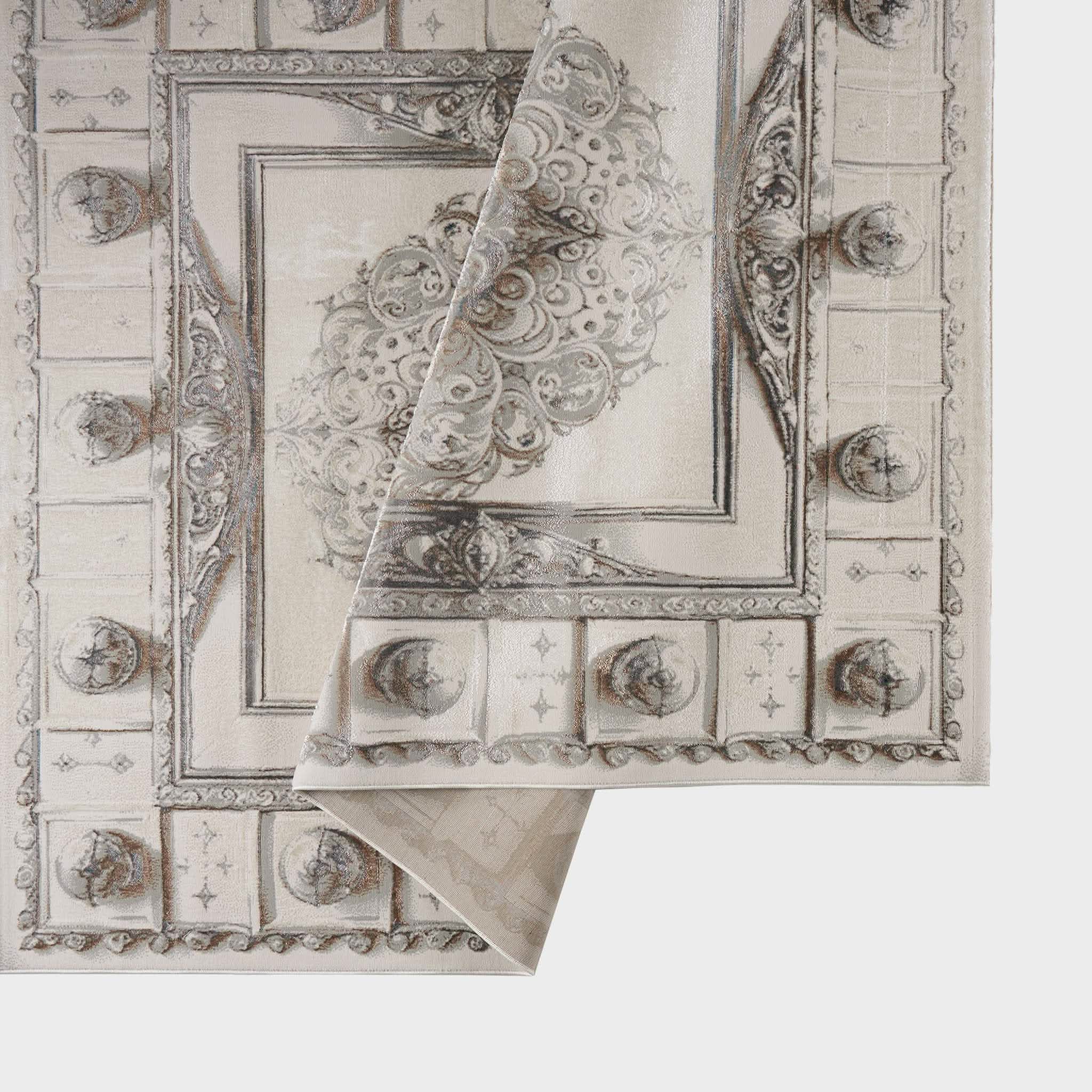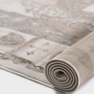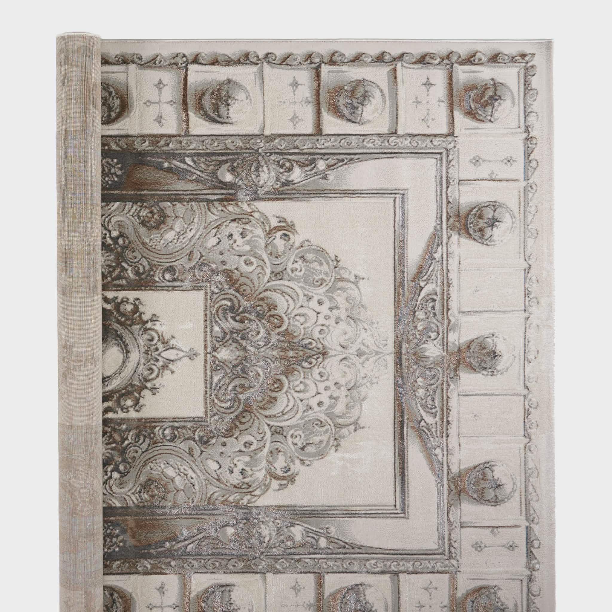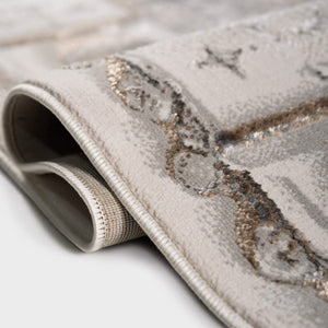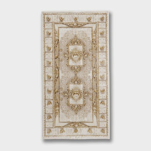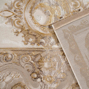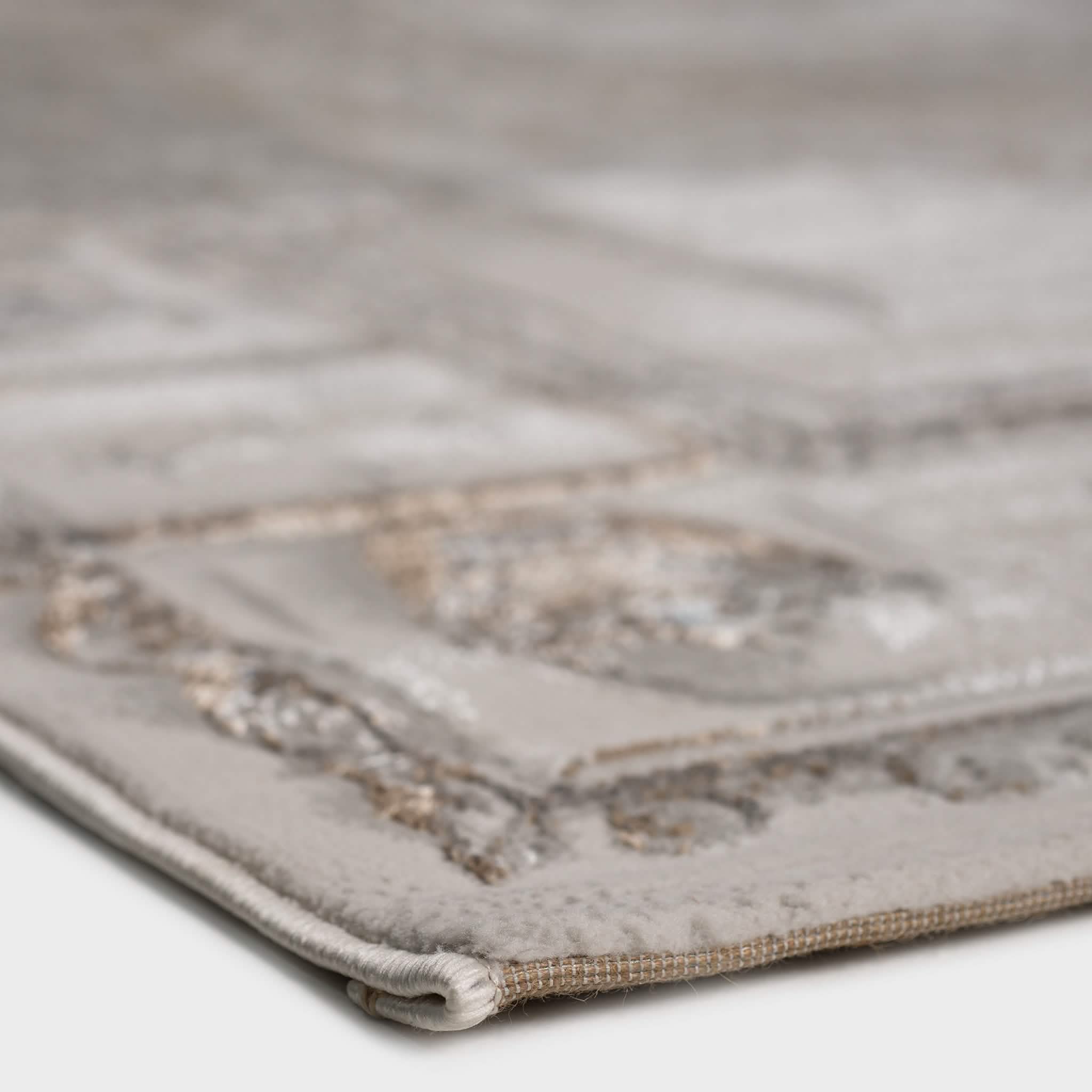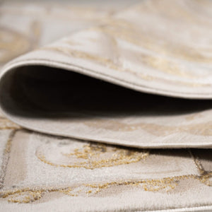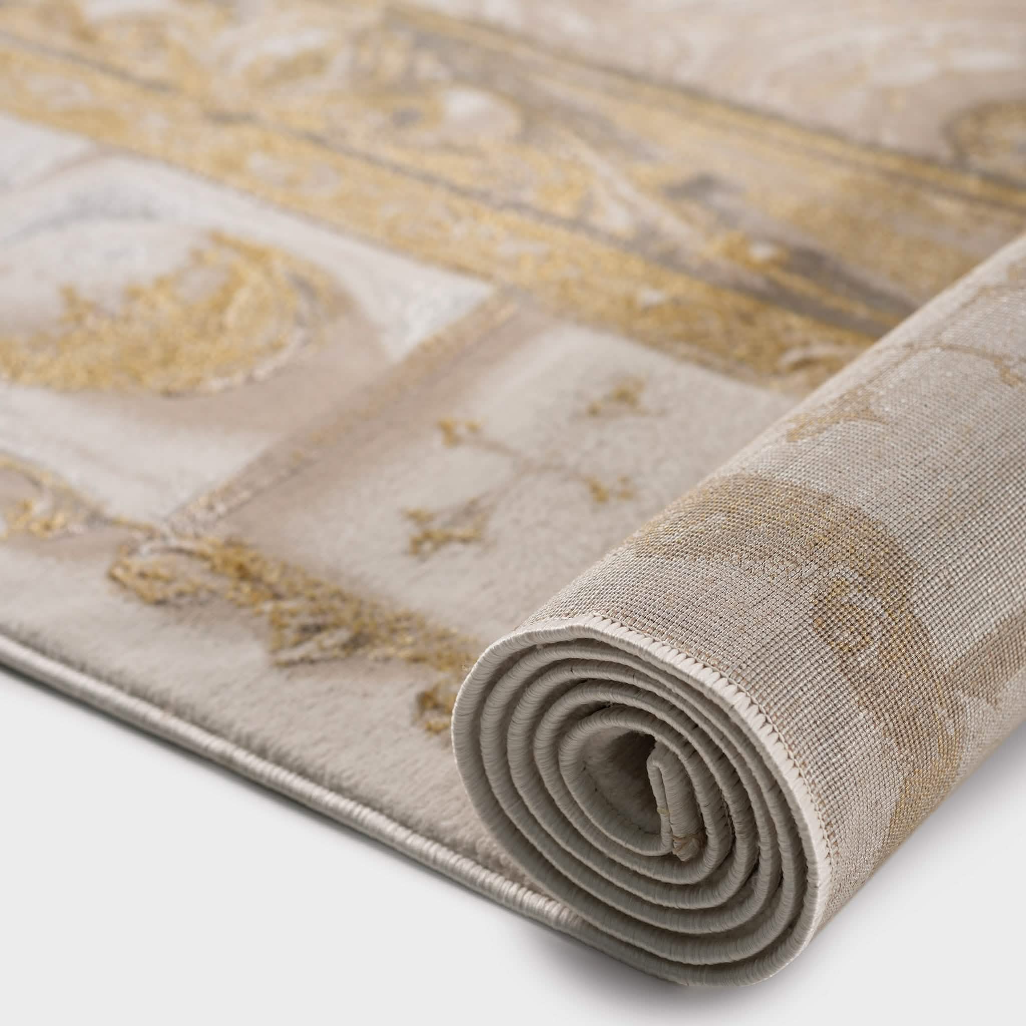 سجادة وصال كلاسيك بألوان ذهبي ورمادي، تصميم أنيق يضيف دفئًا وفخامة وتناسقًا لأي غرفة، خامة بوليستر عالية الجودة.